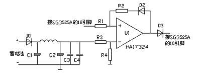 如圖5所示,D1為蓄電池極性反接保護。SG3525A的引腳16輸出參考電壓5V,取R3=R4=10kΩ。在正常情況下,U1的反相輸入端電壓大于正向輸入端電壓,U1輸出低電平,二極管D1、D2截止。當蓄電池電壓低于10V時,比較器U1開始工作,輸出由低電平變為高電平,D2、D3導通,并把同相輸入端電位提升為高電平,使得U1一直穩定輸出高電平,向SG3525A的引腳10輸出關斷信號。