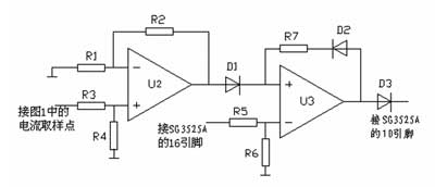 如圖6所示,運放U2及外圍電阻構成反比例放大器,運放U3及外圍電路構成比較器。圖1中的R3為取樣電阻,取2.2Ω,2W。當負載電流增大時,該電阻的壓降△U增大。