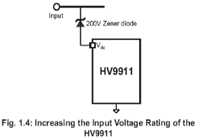 IC內部提供穩壓電路9∼250V輸入電壓,可輸出7.75V電壓輸出提供IC內部電源使用,若輸入電壓范圍提升可經由外接一個200V,2WZenerDiode于輸入電壓與IC的Vinpin之間(如圖1-4),這可使得輸入電壓范圍可提升至450VDC,亦可以使得IC內部穩壓電路所產生的功率損耗分散一部份在ZenerDiode上。
