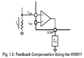 閉回路控制的形成是連接輸出電流信號至FDBKpin,同時將電流參考位準連接至IREFpin,補償網絡連接至Comppin(傳導運算放大器的輸出端),如圖5所示。放大器的輸出受PWM調光信號所控制,當PWM調光信號為High時放大器的輸端連接至補償網絡,當PWM調光信號為Low時,放大器的輸出端與補償網絡被切斷,因此補償網絡內的電容電壓維持住,一直到PWM調光信號再度回復High準位時,補償網絡才又連接圖放大器的輸出端,這樣可確保電路動作正常以及獲得非常良好的PWM調光反應,而不需要設計一個快速的控制電路。