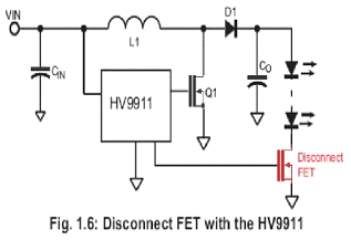 FAULT信號pin可用于驅動外部斷接FET(圖6)IC啟動時,FAULT信號維持Low電位,IC啟動過后,此pin被pulledhigh,這使得內電路的LED與升壓電路連接,電路完成啟動點亮LED,假如輸出端有過電壓或短路情形發生,內部電路會將FAULT信號拉Low并使LED與升壓電路斷接。