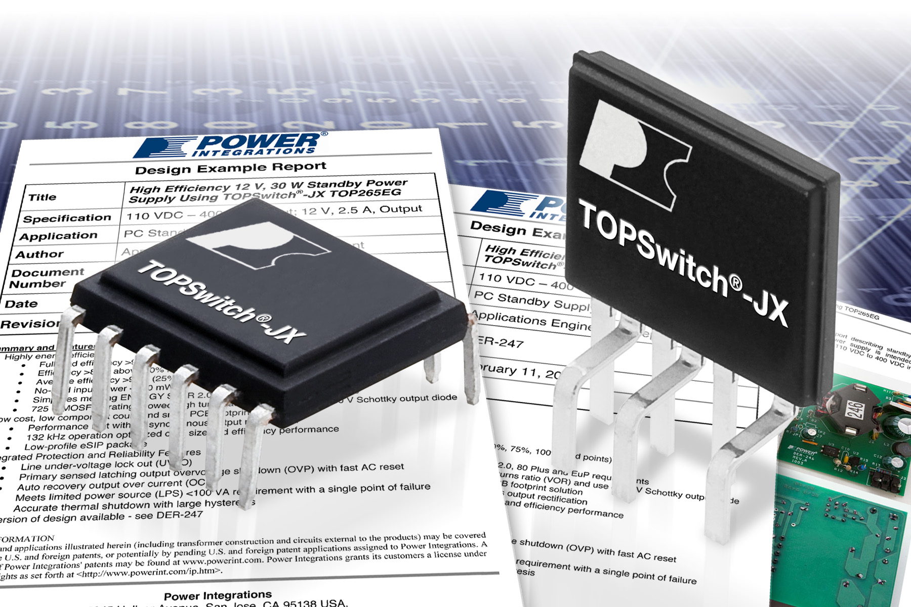 DER-246是一個通用評估平臺,它介紹的是一款基于TOPSwitch-JX TOP265EG設計的PC待機電源,該電源的工作輸入范圍為110 VDC至400 VDC,輸出為12 V, 15 W,效率超過91%。DER-247基于TOPSwitch-JX TOP264EG設計而成,它所介紹的電源適用于類似的應用,其工作輸入范圍為110 VDC至400 VDC,輸出為5 V, 10 W,效率超過87%。對于電視機和其他消費類產品來說,這些設計在輸入功率僅為100 mW的情況下可提供20 mW的輸出功率。