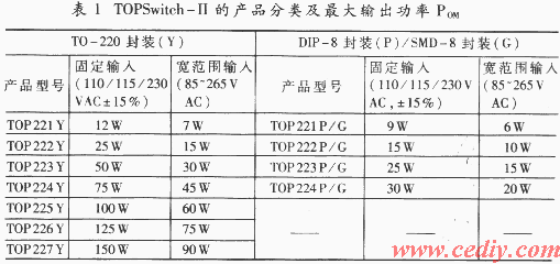 根據封裝形式,TOPSwitch-II可劃分成三種類型:TOP221Y~227Y(TO-220封裝),TOP221P~224P(DIP-8封裝),TOP221G~224G(SMD-8封裝),產品分類詳見表1。
