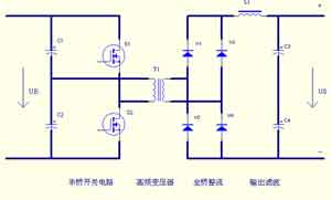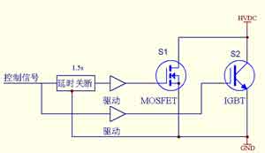 DC/DC功率變換器采用半橋電路拓撲,功率器件少,控制簡單,可靠性高。如圖5所示,采用MOSFET和IGBT并聯技術,充分利用了MOSFET開關速度快和IGBT導通壓降低的優點。在電路上采取措施,使得MOSFET的關斷時間比IGBT延遲一定的時間,大大減小了IGBT的電流拖尾,降低了開關通態損耗,提高了效率和可靠性,使得半橋電路的輸出功率可以實現7kW。其輸出側采用的整流方式有半波整流,中心抽頭全波整流及全橋整流。由于輸出電壓較高,全橋整流對變壓器利用率高,比較適合用于這種場合。