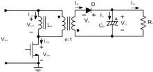 [page]當開關閉合時,電壓施加在變壓器初級的兩端,因為此時次級二極管是截止的,變壓器所起的作用就像電感器。經過初級線圈的電流會上升,同時能量儲存在磁通量中。當開關斷開時,次級二極管導通,電流通過次級時會下降,因為能量被轉換至次邊大容量電容器。如果電流經過磁化電感區后降至零,這是不連續導通模式。如果磁化電流未降至零,如圖3所示,則系統以連續導通模式工作。
