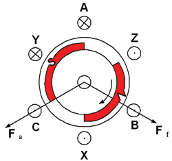 得知Hall輸出信號(hào)與轉(zhuǎn)子磁動(dòng)勢(shì)位置的關(guān)系之后,可以產(chǎn)生正六邊形的旋轉(zhuǎn)磁場(chǎng),如圖4所示,AB相繞組通電,產(chǎn)生圖中合成磁勢(shì)Fa,由于Fa的牽引,F(xiàn)f將會(huì)順時(shí)針旋轉(zhuǎn),旋轉(zhuǎn)到X位置后,換成給AC相通電,則Fa順時(shí)針跳躍60°電角度,牽引Ff順時(shí)針旋轉(zhuǎn)60°,依次類(lèi)推,通電順序按照AB-AC-BC-BA-CA-CB-AB循環(huán),則帶動(dòng)永磁轉(zhuǎn)子順時(shí)針旋轉(zhuǎn)。這就是傳統(tǒng)的方波控制方式。