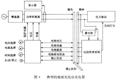 圖3為一典型的地面充電站中充電器的方案,該充電器由一個(gè)能將輸人的交流電轉(zhuǎn)換為直流電的整流器和一個(gè)能調(diào)節(jié)直流電功率的功率轉(zhuǎn)換器組成,通過(guò)把帶電線(xiàn)的插頭插入電動(dòng)汽車(chē)上配套的插座中,直流電能就輸入蓄電池對(duì)其充電。充電器設(shè)置了一個(gè)鎖止杠桿以利于插入和取出插頭,同時(shí)杠桿還能提供一個(gè)確定已經(jīng)鎖緊的信號(hào)以確保安全。根據(jù)充電器和車(chē)上電池管理系統(tǒng)相互之間的通訊,功率轉(zhuǎn)換器能在線(xiàn)調(diào)節(jié)直流充電功率,而且充電器能顯示充電電壓、充電電流、充電量和充電費(fèi)用等。