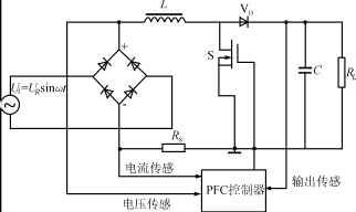 開關電源的功率因數校正器(PFC)可分為兩類,一類為有源PFC,由電感電容及電子元器件組成;另一類為無源PFC,一般采用電感補償方法使交流輸入的基波電流與電壓之間相位差減小來提高功率因數。在校正電路中有源PFC較多采用高頻升壓電路功率因數開關調節器,通常采用Boost電路,基本電路拓樸見圖1。