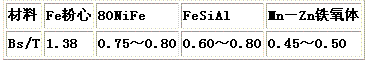 目前扼流圈鐵心使用的材料主要有兩類,一類是功率鐵氧體磁心加開氣隙,另一類是磁粉心。表1是它們的飽和磁感應強度(Bs)的比較,其中錳鋅軟磁鐵氧體Bs值最低,為0.5T,約為鐵粉心的一半左右,因此在同樣安匝數下和鐵粉心相比截面將增加1倍左右,因而體積勢必增大。