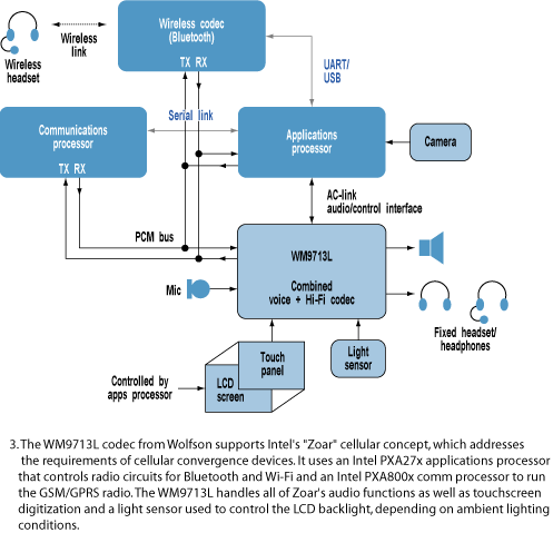 在目前的大部分電話之中,這個高保真系統是一個獨立的芯片,它含有一個立體聲DAC、一個立體聲ADC、若干耳機和揚聲器驅動器、麥克風預放大器等等。但類似Wolfson這樣的公司目前尋求把所有這一切都集成在一起,以便該處理器可以實現語音播放和鈴聲、語音信號、藍牙連接以及更多的功能(參見圖3)。