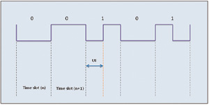 S/PDIF協議——如上文所述,它是一種單線串行接口,時鐘嵌入數據之中。傳輸的數據采用雙相標記編碼。時鐘和幀同步信號在接收器端與雙相解碼數據流一同恢復。數據流中的每個數據位都有一個時隙。時隙以一個躍遷開始,并以一個躍遷結束。如果傳輸的數據位是“1”,則時隙中間還會增加一個躍遷。數據位“0”則不需要額外躍遷,躍遷之間的最短間隔稱為單位間隔(UI)。