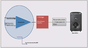為了解調PWM并重建原始模擬波形,需要使用由LC(電感+電容)構成的高質量低通濾波器。由于大多數音頻系統使用DSP,因此D類放大器對音頻系統設計很有利。音頻信號可以由DSP本身調制為PWM,然后直接饋送至D類放大器的輸入端,而無須使用音頻DAC或編解碼器。因此,除了提高放大器功率效率以外,它還能通過消除編解碼器/DAC來降低系統成本。對于D類放大器設計而言,低通重建濾波器是確保良好THD指標的最重要因素。
