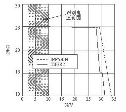 如圖4所示為使用MOSFET(V3)的開關電路。VDZ4及VDZ5分別采用28V及15V穩壓管。當輸入電壓超過28V時VDZ4被反向擊穿,使V3導通,將電源開啟。當輸入電壓超過43V時VDZ5也被反向擊穿,能限制V3的柵-源電壓,起到保護作用。R15能防止V3被誤導通。該以太網電源模塊的識別信號阻抗與輸入電壓的關系曲線如圖5所示,識別電壓范圍是2.5~10V。
