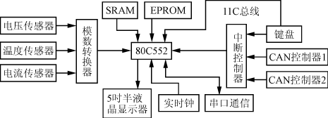 系統(tǒng)的主要功能包括數(shù)據(jù)采集、電量估計及顯示診斷等。由于80C552具有8路10位A/D轉(zhuǎn)換的功能,因此,采集模塊先采用線性光耦法測量單電池的電壓,通過其4個A/D口將模擬量轉(zhuǎn)換為數(shù)字量存入存儲器,溫度測量采用單總線技術(shù),使用Dallas數(shù)字芯片來測量溫度,該芯片具有12位的精度等級,能非常準(zhǔn)確地測量到系統(tǒng)的溫度。總電壓、電流信號通過特殊的傳感器將其信號轉(zhuǎn)換為0~10V的信號,通過14位的A/D轉(zhuǎn)換器件轉(zhuǎn)換為數(shù)字量存入系統(tǒng)。