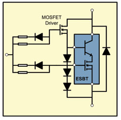 當(dāng)一個ESBT同外置MOSFET和二極管/電阻配對的時候,整個電路看起來像一個3端器件,經(jīng)驅(qū)動后能達(dá)類似IGBT或功率MOSFET的工作狀態(tài)。ESBT的關(guān)斷能量比IGBT低很多,能實(shí)現(xiàn)高效設(shè)計,并非常適合高頻率、高壓逆變器設(shè)計。