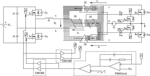 為了避免上述這種傳統CDR拓撲結構的不足,PengC提出了一種IM-CDR電路拓撲,如圖1(b)所示。它將以往的CDR整流電路中的3個分立磁性元件(輸出濾波電感和變壓器)集中繞制在同一副磁芯中,結果大大地減小了變流器的體積和重量,但是,由于它副邊仍然有較多的繞組數和連接端子,使得這種CDR拓撲的應用受到了限制。