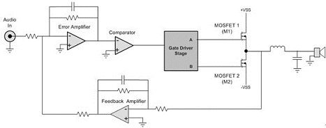 PWM信號進行適當的電平變換,然后送到柵極驅動器,這個驅動器控制由MOSFET(M1和M2)組成的雙態功率電路。放大后的信號然后通過輸出濾波器(消除PWM載波頻率),最終僅僅放大了的模擬音頻信號驅動揚聲器。通過把濾波器輸入信號反饋到錯誤放大器輸入端,進行外部環路濾波,降低了失真和噪聲,進一步提高了音頻輸出保真度。