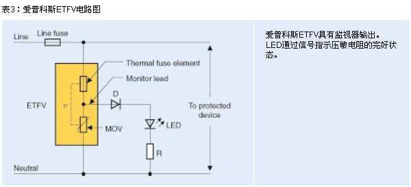 為使太陽能逆變器制造商以低成本滿足各大標準及保險公司的嚴格要求,TDK-EPC現開發出 ETFV系列(愛普科斯熱熔式壓敏電阻)。這些組件通過串聯電路組合在一起,包括一個壓敏電阻和一個熱熔絲。如果壓敏電阻已嚴重退化,并致使較高漏電流導致過熱,熔絲將熔斷以斷開壓敏電阻。上述元件的一大特色便是監視引線:通過延伸壓敏電阻與熱熔絲之間的觸點以驅動LED(參見圖3)。