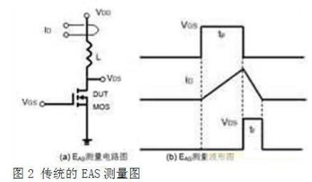 過去,傳統的測量EAS的電路圖和波形如圖2所示。注意到,VDS最后的電壓沒有降到0,而是VDD,也就是有部分的能量沒有轉換到雪崩能量中。
