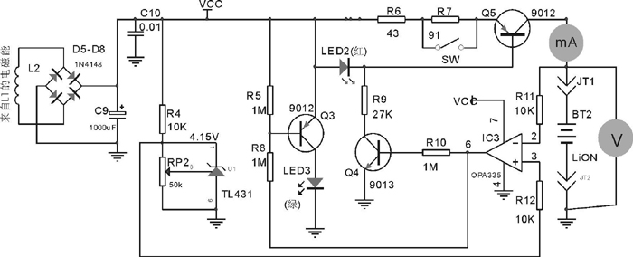 當充電使電壓表讀數達到4.15V時,LED3熄且LED2亮,同時電流表讀數為零,表明電池BT2已被充滿并自動停止充電,并且顯示這一狀態。