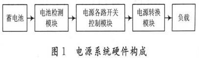 本電源系統(tǒng)各部分主要實(shí)現(xiàn)的功能如下:供電電源由2塊12 V的鉛酸蓄電池串聯(lián)而成,為系統(tǒng)提供24 V的直流電壓;電池檢測(cè)模塊主要是通過(guò)對(duì)供電電源的輸出電壓進(jìn)行取樣,以獲取蓄電池的電量消耗信息,實(shí)時(shí)對(duì)電池充電以保證整個(gè)系統(tǒng)正常穩(wěn)定的工作;電源各路開關(guān)控制模塊主要是根據(jù)系統(tǒng)負(fù)載的工作狀態(tài),通過(guò)開關(guān)控制決定是否為該負(fù)載供電,以此來(lái)降低待機(jī)功耗,延長(zhǎng)電池的使用時(shí)間;電源變換模塊主要用模塊DC-DC轉(zhuǎn)換器作為構(gòu)建單元實(shí)現(xiàn)電源電壓的轉(zhuǎn)換為負(fù)載提供合適的電壓。