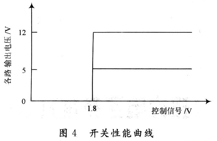 場(chǎng)效應(yīng)管選擇了增強(qiáng)型P溝道場(chǎng)效應(yīng)管IRF9640和增強(qiáng)型N溝道場(chǎng)效應(yīng)管VN2222L。以場(chǎng)效應(yīng)管IRF9640作為開關(guān)管來(lái)控制電路的通和斷,以場(chǎng)效應(yīng)管VN2222L作為開關(guān)控制管來(lái)控制場(chǎng)效應(yīng)管IRF9640的開和關(guān)。當(dāng)控制信號(hào)輸入端輸入高電平時(shí),開關(guān)電路導(dǎo)通;當(dāng)控制信號(hào)輸入端輸入低電平時(shí),開關(guān)電路斷開。經(jīng)過(guò)試驗(yàn)測(cè)得:當(dāng)控制信號(hào)電壓從0 V逐漸上升到1.8 V時(shí)開關(guān)導(dǎo)通;當(dāng)電壓從高電平(如3.3 V)逐漸下降到1.8 V時(shí)開關(guān)斷開。此開關(guān)電路的性能如圖4所示。