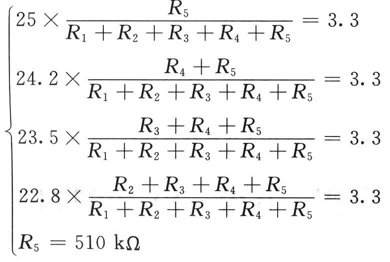 電池電壓取樣電阻網(wǎng)絡(luò)是通過(guò)取樣電阻的組合對(duì)電池的輸出電壓進(jìn)行分壓取樣,各電阻端點(diǎn)對(duì)應(yīng)的電池電壓狀態(tài)值分別為:R2對(duì)應(yīng)22.8 V,R3對(duì)應(yīng)23.5 V,R4對(duì)應(yīng)24.2 V,R5對(duì)應(yīng)25 V。當(dāng)電池輸出的電壓值等于各個(gè)電阻設(shè)定的狀態(tài)值時(shí),則該電阻端取樣電壓為3.3 V;當(dāng)電池輸出的電壓值大于各個(gè)電阻設(shè)定的狀態(tài)值時(shí),則該電阻端取樣電壓大于3.3 V;當(dāng)電池輸出的電壓值小于各個(gè)電阻設(shè)定的狀態(tài)值時(shí),則該電阻端取樣電壓小于3.3 V。取樣電阻R1,R2,R3,R4,R5的取值可由下面的方程組求得: