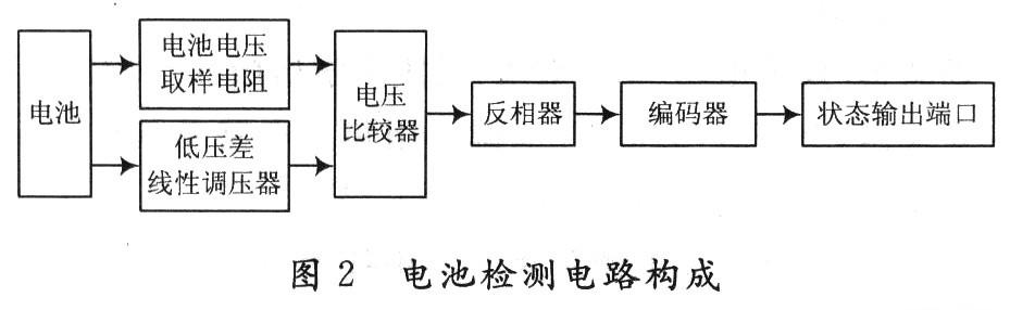 電池檢測(cè)模塊通過(guò)對(duì)供電電源輸出電壓取樣來(lái)判斷蓄電池的電量是否充足。在此將電源輸出電壓劃分為:25 V以上為電池電量滿狀態(tài)、24.2~25 V為電池電量充足狀態(tài)、23.5~24.2 V為電池正常工作狀態(tài)、22.8~23.5 V為電池電量不足但尚能工作狀態(tài)、22.8 V以下為電池不能正常工作狀態(tài)5個(gè)狀態(tài),通過(guò)狀態(tài)讀取來(lái)判斷電池能否正常為整個(gè)系統(tǒng)供電,決定是否為電池充電,以保證整個(gè)系統(tǒng)的正常運(yùn)行。該模塊電路結(jié)構(gòu)如圖2所示。