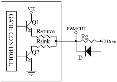 一般IC的PWM OUT輸出如左圖所示,內(nèi)部集成了限流電阻Rsource和Rsink,通常Rsource>Rsink,具體數(shù)值大小同IC的峰值驅(qū)動(dòng)輸出能力有關(guān),可以近似認(rèn)為R=Vcc/Ipeak。一般IC的驅(qū)動(dòng)輸出能力在0.5A左右,因此Rsource在20Ω左右。