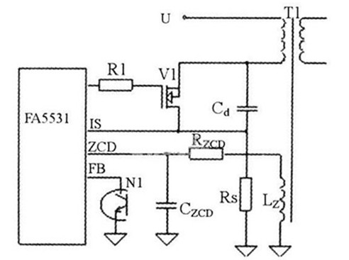 功率隔離變換器電路如圖5所示,由控制電路和反激式變換器組成。圖中,變壓器輔助繞組LZ、電阻RZCD、電容CzcD組成谷底探測電路,為控制芯片FA5531提供谷底檢測信號。光電耦合器N1次級將輸出電壓反饋信號輸入控制芯片。電路啟動后,FA5531輸出驅動信號使V1導通,V1電流上升,此電流由Rs檢測輸入到控制芯片的IS引腳,與由反饋輸入FB引腳的電壓決定的參考電壓進行比較,達到參考電壓時,V1關斷,變壓器繞組電壓反相,變壓器初級電感向次級負載饋送能量。當向次級饋送能量過程結束時,次級電流下降到零。變壓器漏感與開關管寄生電容Cd構成了諧振電路,變壓器輔助繞組感應此諧振電路的諧振電壓,并輸入到FA5531P的ZCD引腳。當次級電流下降到零時,諧振電路的諧振電壓迅速下降,輔助繞組的感應電壓也迅速下降,當ZCD引腳上的電壓降至谷底探測閾值時,FA5531P驅動輸出使V1重新導通。由于電阻RzcD、電容CzcD會引入延時,選擇合適的RzcD、CzcD值,就可實現V1零電壓開通。