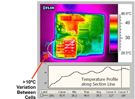 這些原因中的有一些可以通過電池選擇和較好的電池組設計來得到最小化。即便如此,所有前期設計工作中,電池不平衡的主要原因是非均勻熱應力。電池與電池之間的溫度差異可引起阻抗變量和化學反應的變化。這就形成了溫度差異,而電池暴露在這種差異下的時間較長(請參見圖2*)。這是一幅筆記本電腦FLIR圖,其表明溫度差異的程度,即便在消費類電子應用中也是如此。溫度每升高10℃,一節鋰離子電池的自放電率便翻一番。鋰離子電池的一個特點是,內部阻抗是溫度的函數。較低溫度的電池表現出高阻抗,因此在充電或放電期間IR壓降更大。這種電阻還隨暴露在高充電狀態和高溫下持續時間的增加以及充電周期時間的延長而增大。