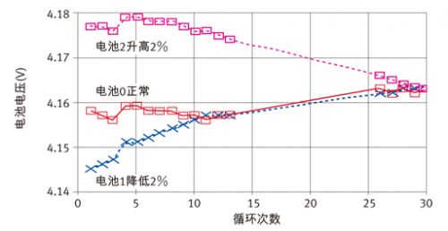 電池平衡算法只使用電壓發散作為平衡標準,具有過平衡(或欠平衡)的缺點,這是由于存在阻抗失衡影響(請參見圖3和圖4)。問題是,電池阻抗還會在充電期間引起電壓差異(VDiff_Start和VDiff_End)。簡單的電壓電池平衡并未區分是電量失衡還是阻抗失衡。因此,這種平衡不能保證完全充電后所有電池均獲得100%的電量。