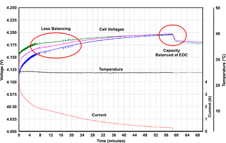 筆記本電腦中,有效的平衡電流通常為25到50mA,其為內部旁路平衡的12到20倍。利用這個優勢,有源電池平衡可以在一個周期(95%時間)內對電量失衡進行校正。