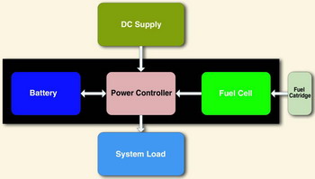 上述系統(tǒng)在使用的不同階段,能夠用做三種能源和兩種負載。當(dāng)該系統(tǒng)沒有插接直流電源時,燃料電池和/或蓄電池的組合結(jié)構(gòu)能夠為系統(tǒng)負載供電。另外,當(dāng)直流電源不存在時,燃料電池還能夠?qū)π铍姵剡M行充電,以盡可能地增強電源斷電末期(end-of-power-shutdown)的性能,或者實現(xiàn)更好的系統(tǒng)動態(tài)電源響應(yīng)特性。當(dāng)直流電源可用時,它既對蓄電池進行充電也對系統(tǒng)負載進行供電。
