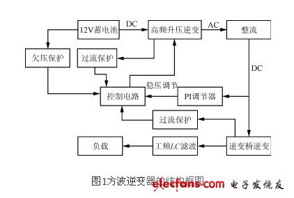 本逆變電源輸入端為蓄電池(+12V,容量90A·h),輸出端為工頻方波電壓(50Hz,310V)。其結構框圖如圖1所示。