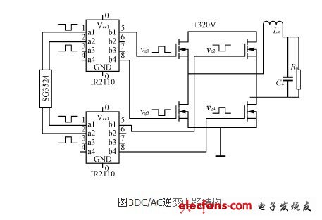 如圖3所示,DC/AC變換采用單相輸出,全橋逆變形式,為減小逆變電源的體積,降低成本,輸出使用工頻LC濾波。由4個IRF740構成橋式逆變電路,IRF740最高耐壓400V,電流10A,功耗125W,利用半橋驅動器IR2110提供驅動信號,其輸入波形由SG3524提供,同理可調節該 SG3524的輸出驅動波形的D<50%,保證逆變的驅動方波有共同的死區時間。