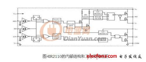 IR2110 的內部結構和工作原理框圖如圖4所示。圖中HIN和LIN為逆變橋中同一橋臂上下兩個功率MOS的驅動脈沖信號輸入端。SD為保護信號輸入端,當該腳接高電平時,IR2110的輸出信號全被封鎖,其對應的輸出端恒為低電平;而當該腳接低電平時,IR2110的輸出信號跟隨HIN和LIN而變化,在實際電路里,該端接用戶的保護電路的輸出。HO和LO是兩路驅動信號輸出端,驅動同一橋臂的 MOSFET。
