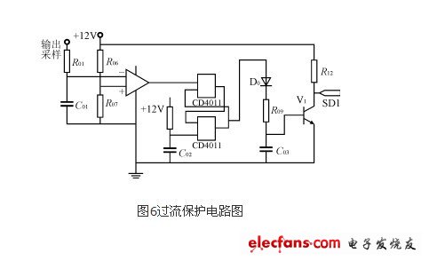 過流保護電路如圖6所示,它監測輸出電流狀況,預設為1.5A。方波逆變器的輸出電流經過采樣進入運算放大器的反向輸入端,當輸出電流大于1.5A后,運算放大器的輸出端跳轉為負,經過 CD4011組成的R-S觸發器后,使三級管V1基級的信號為低電平,三級管截止,向IR2011的SD1端輸出高電平,達到保護的目的。
