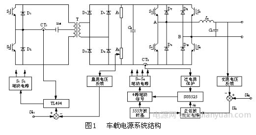 車(chē)載電源系統(tǒng)如圖1所示。12V直流電壓經(jīng)過(guò)高頻逆變和高頻整流,得到一個(gè)符合要求的350V直流電壓,該部分的控制信號(hào)由TL494芯片產(chǎn)生。