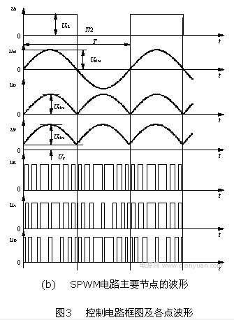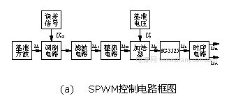 要得到正弦電壓的輸出,就要使逆變電路的控制信號(hào)以SPWM方式控制功率管的開(kāi)關(guān),所得到的脈沖方波輸出再經(jīng)過(guò)濾波就可以得到正弦輸出電壓。通過(guò)SG3525來(lái)實(shí)現(xiàn)輸出正弦電壓,首先要得到SPWM的調(diào)制信號(hào),而要得到SPWM調(diào)制信號(hào),必須得有一個(gè)幅值在1~3.5V,按正弦規(guī)律變化的饅頭波,將它加到SG3525腳2,并與鋸齒波比較,就可得到正弦脈寬調(diào)制波實(shí)現(xiàn)SPWM的控制電路框圖如圖3(a)所示,實(shí)際電路各點(diǎn)的波形如圖3(b)所示。