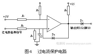 過(guò)電流保護(hù)采用電流互感器作為電流檢測(cè)元件,其具有足夠快的響應(yīng)速度,能夠在IGBT允許的過(guò)流時(shí)間內(nèi)將其關(guān)斷,起到保護(hù)作用。如圖1所示,過(guò)流保護(hù)信號(hào)取自CT2,經(jīng)分壓、濾波后加至電壓比較器的同相輸入端,如圖4所示。當(dāng)同相輸入端過(guò)電流檢測(cè)信號(hào)比反相輸入端參考電平高時(shí),比較器輸出高電平,使D2從原來(lái)的反向偏置狀態(tài)轉(zhuǎn)變?yōu)檎驅(qū)ǎ淹喽穗娢惶嵘秊楦唠娖剑闺妷罕容^器一直穩(wěn)定輸出高電平。同時(shí),該過(guò)電流信號(hào)還送到SG3525的腳10。當(dāng)SG3525的腳10為高電平時(shí),其腳11及腳14上輸出的脈寬調(diào)制脈沖就會(huì)立即消失而成為零。