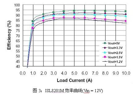 從效率的角度看,ISL8201M實現了極佳的性能。此外,QFN封裝優良的熱性能可以實現非常緊湊的設計,而不需要散熱片。這使得ISL8201M達到了大約200W/in3的功率密度,約為傳統開放式框架模塊的4倍。