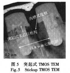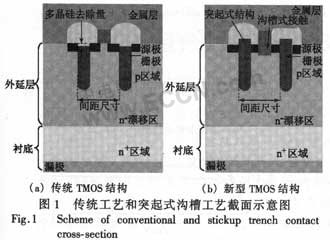 當相鄰單位元胞尺寸不斷縮小后,尤其在設計柵極氧化膜較薄的器件時,在傳統的TMOS工藝中,源區注入會穿透柵極側壁影響器件性能。采用突起式結構可以有效地避免刻蝕工藝及源區注入對較短溝道器件的間接影響,消除了器件穿通的風險,保證了器件的穩定性能和可重復性。