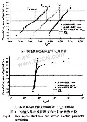當單位元胞相鄰間距為1.4 μm工藝時,由于設計的溝道長度大約為0.5μm,源區結深大致為0.3μm,不得不考慮到傳統工藝下源區注入時,多晶硅刻蝕工藝波動所帶來的器件性能下降的風險。在傳統工藝中,當多晶硅淀積完成后,須通過刻蝕來形成柵極區域,但是多晶硅去除量難以精準控制,同時考慮到刻蝕工藝面內均勻性的特點,Si片內中心與邊緣的去除量無法保證相同,從而為隨后的源區注人工藝留下了潛在的風險。如圖2傳統TMOS與突起式TMOS工藝比較圖2(e)所示,當源區注入時,如果柵極多晶硅刻蝕量過多,會導致源區高濃度的As+離子從柵極邊緣注入到溝道中,間接地減少了溝道長度,從而降低了閾值開啟電壓(Vth),尤其當溝道長度較短時,甚至會導致器件在正常工作狀態時發生漏源間穿通效應,最終導致器件失效。本文采用K·Shenai的突起式結構,在形成溝槽之后,先保留之前所生長的氧化層,然后直接生長柵極氧化膜和多晶硅,在柵極多晶硅形成后,才將先前生長的氧化層去掉,由此便形成了突起式多晶硅結構,從而可以保證在隨后的源區As+離子注入時,As+離子無法從溝槽側壁注入到溝道中,從根本上避免了發生源漏極之間穿通的可能性,降低了器件對刻蝕工藝的依賴程度。這點在器件柵極氧化膜厚度較薄的情況下尤其明顯,此時如果采用傳統工藝,源區離子注入時,As+離子更容易從側壁注入到溝道中,從而影響溝道長度。
