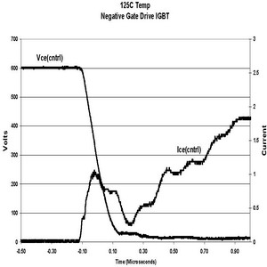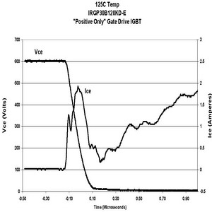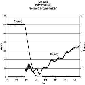 在相同的測試條件下,當柵電壓是在0V或單正向柵驅動情況下,IRGP30B120KD的電路性能顯示dV/dt感生開通電流減小比例為21:1。如果IGBT采用這種方式驅動,電流很小,對功耗的影響幾乎可以忽略。
