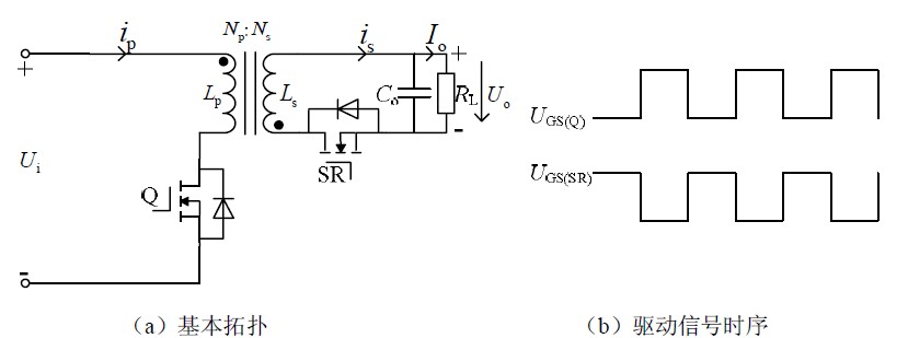 反激變換器次級的整流二極管用同步整流管SR 代替,構(gòu)成同步整流反激變換器,基本拓撲如圖1(a)所示。為實現(xiàn)反激變換器的同步整流,初級MOS 管Q 和次級同步整流管SR 必須按順序工作,即兩管的導(dǎo)通時間不能重疊。當初級MOS 管Q 導(dǎo)通時,SR 關(guān)斷,變壓器存儲能量;當初級MOS 管Q 關(guān)斷時,SR 導(dǎo)通,變壓器將存儲的能量傳送到負載。驅(qū)動信號時序如圖1(b)所示。在實際電路中,為了避免初級MOS 管Q 和次級同步整流管SR 同時導(dǎo)通,Q 的關(guān)斷時刻和SR 導(dǎo)通時刻之間應(yīng)有延遲;同樣Q 的導(dǎo)通時刻和SR 的關(guān)斷時刻之間也應(yīng)該有延遲。
