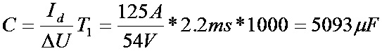 式中,Id為輸入電流125A;△U為電壓變化量(△U =Ud0×10%=54V);T1為電容放電時間; Ud0為空載直流電壓540V;T為工頻交流電周期20ms;為工頻交流電角頻率),可得: