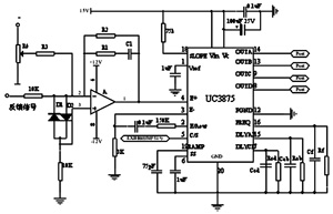 PWM移相控制是通過UC3875的誤差放大器來實現的,在UC3875的4角上接PI調節器,利用電壓傳感器將輸出電壓與給定基準電壓相比較,從而控制A、B與C、D之間的相位,最終調整波形占空比,使電源穩定在預定值上。A/B、D/C兩個半橋,可單獨進行導通延時(即死區時間)的控制,在該死區時間內確保下一個功率開關器件的輸出電容放電完畢,為即將導通的開關器件提供電壓開通條件。圖3所示是本設計的控制電路圖。