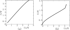 根據所設計的檢測電路進行實驗,實驗時,調節(jié)輸入電壓Ui的大小,并檢測與之對應的輸出電壓UO的大小,實驗結果如表1(a)所示。為了進行對比,同時測出沒有反饋的光耦的輸入與輸出電壓關系,并列在表1(b)。根據表1中(a)、(b)的數據分別繪出檢測電路與單個光耦的傳輸特性,分別如圖3(a)、(b)所示。