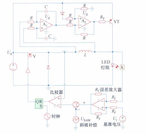 LED 燈組為n 個大功率LED 串聯(lián)連接,UO =nUF為LED 燈組壓降; UF為單個LED 的導(dǎo)通壓降。